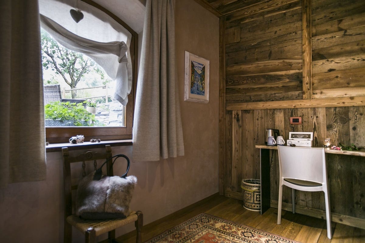 Questa meravigliosa villa rustica immersa nel verde è stata costruita interamente dai proprietari. Il fascino degli esterni è il preludio di ciò che si scopre all’interno: quattro camere, di cui due ampie e luminose Suites e due accoglienti camere doppie. Gli arredi fondono con armonia elementi moderni a elementi della tradizione valdostana, i colori delle pareti si intonano con i tessuti pregiati e l’utilizzo di legno vecchio è una costante, che rende l’atmosfera piacevole e calorosa. Ogni camera è dotata di tutti i comfort e le suites dispongono di spaziosi e comodi divani, con adiacente zona lettura e tisaneria. La Suite Ciel, situata nel sottotetto e dotata di balcone, regala una splendida vista montagne mentre la Suite Terre, posizionata a pian terreno accoglie gli ospiti con i suoi giochi di luce. I bagni donano emozioni sensoriali uniche, grazie alle docce king size con idromassaggio e cromoterapia. Le due camere doppie sono situate al pian terreno e mantengono i tratti caratteristici di questo b&b. L’abbondante colazione a buffet è servita nella sala con zona living, in cui la modernità incontra il passato in un connubio perfetto. Nel giardino esterno è stata adibita un’area wellness con una Sauna Finlandese che rispecchia un autentico chalet di montagna e un idromassaggio con cromoterapia. La cura dei dettagli e l’accoglienza degli ospiti caratterizzano questo b&b a gestione famigliare.